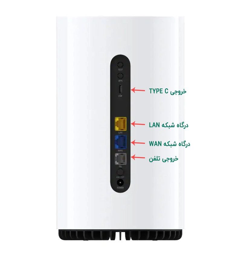 درگاههای مودمیک پورت شبکه LAN، یک پورت WAN، یک پورت RJ11 (تلفن)، پورت type C